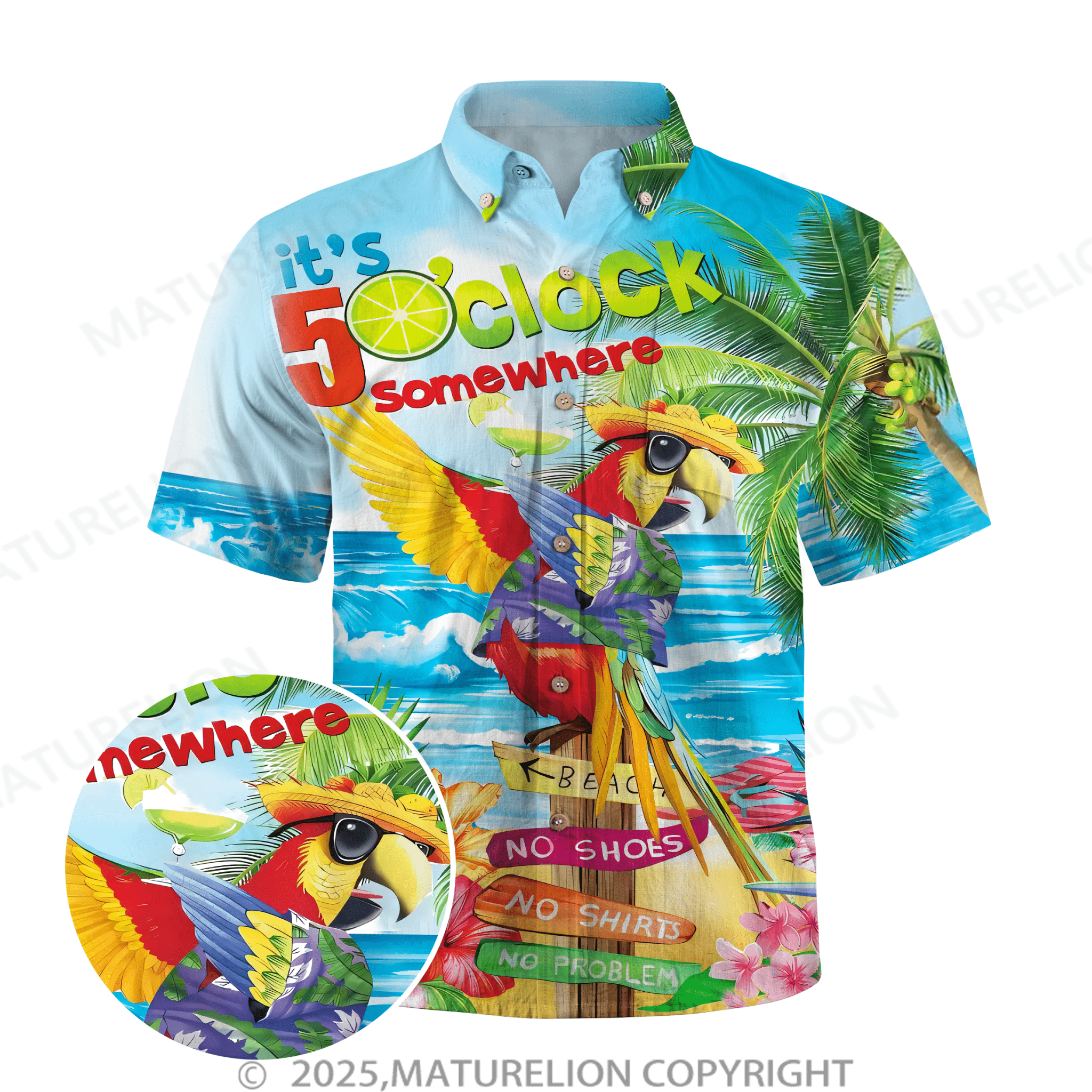 Maturelion Party Shirts It's 5 O'Clock Somewhere Parrot Chest Pocket Short Sleeve Hawaiian Shirt$49.98 USD -