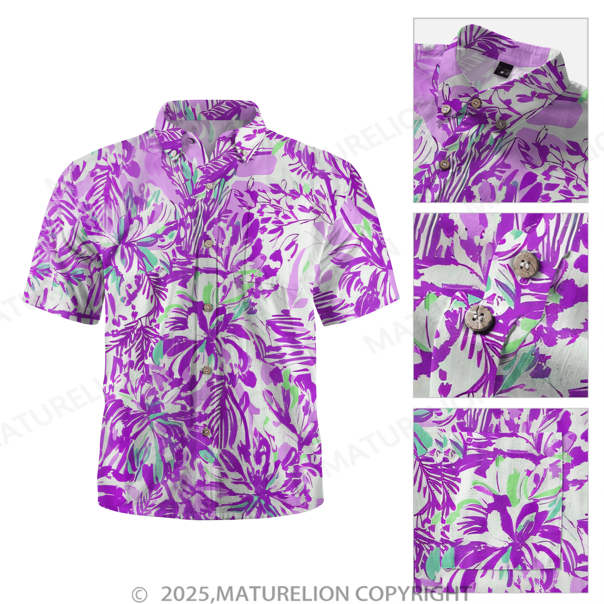 Maturelion Purple Floral Buttons Print Hawaiian Shirt$49.98 USD -