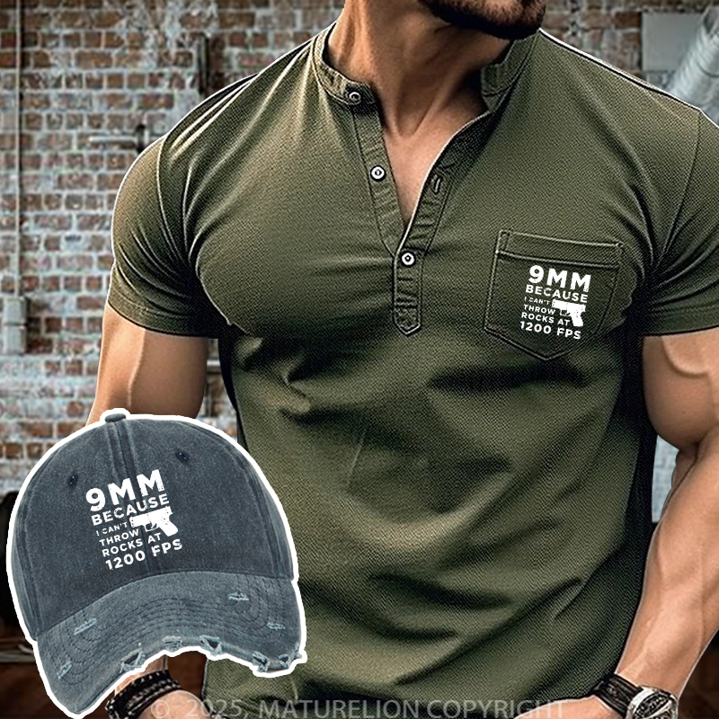 Maturelion 9mm Because I Can't Throw Rocks At 1200 Fps Henley Shirt and Hat Set$42.48 USD $49.98 USD
