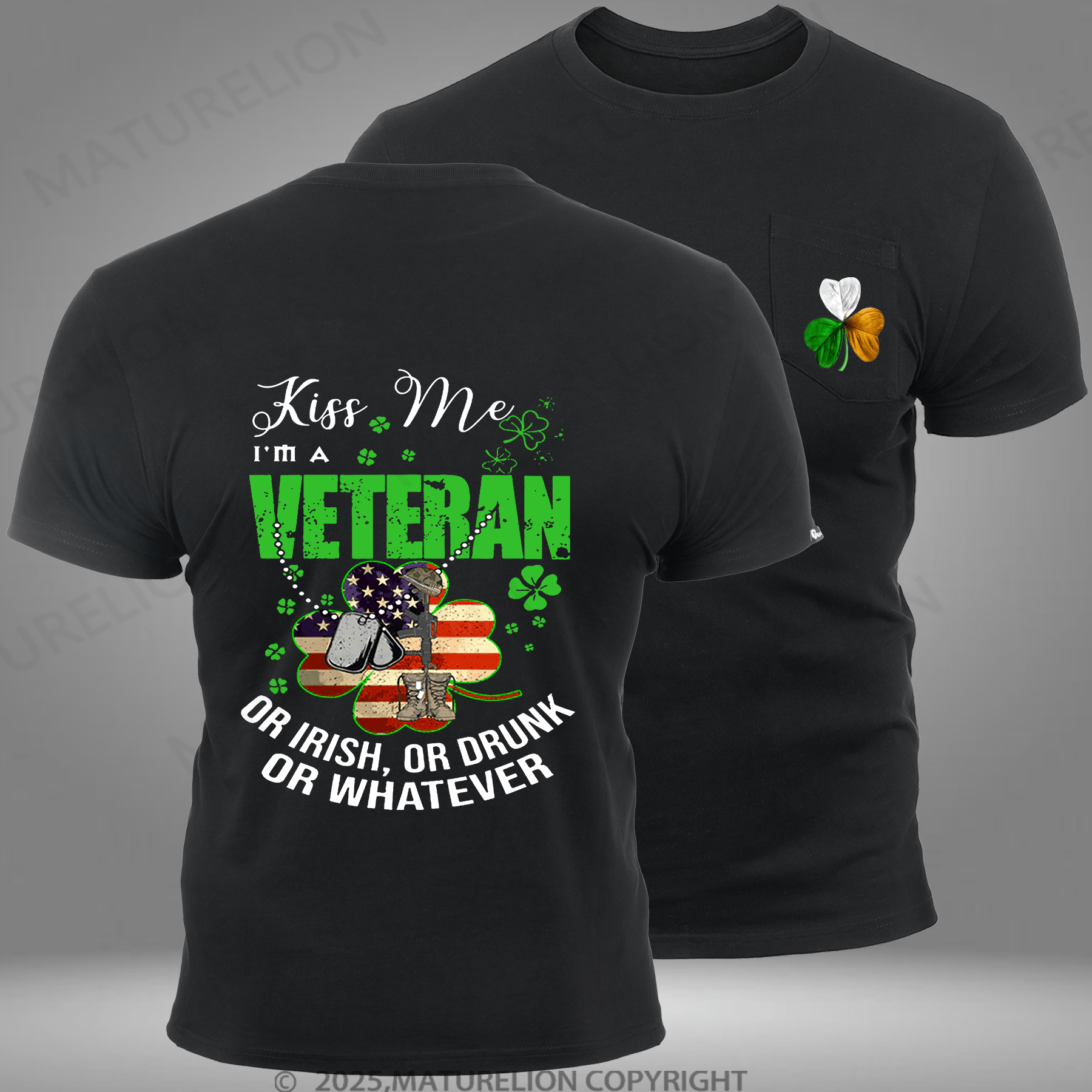 Maturelion St Patrick's T-shirt IM A Veteran Or Irish Or Drunk Or Whatever Patricks Pocket T-shirt$29.99 USD -