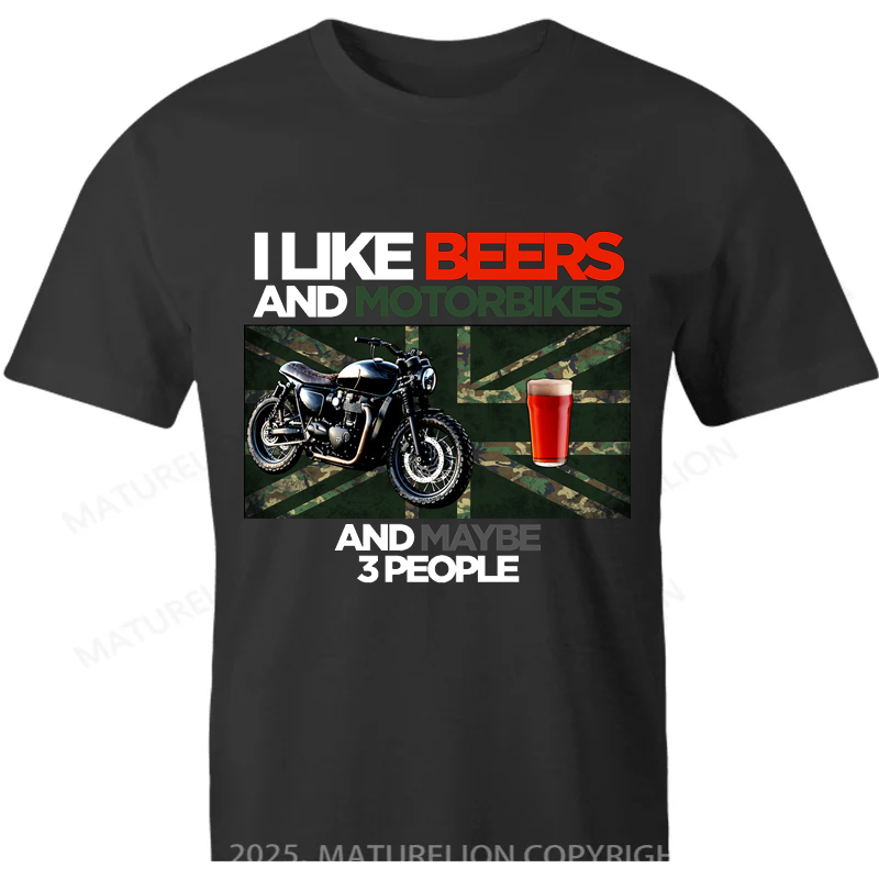 Maturelion British T-shirt I Like Beers And Motorbikes And Maybe 3 People T-shirt$22.99 USD -