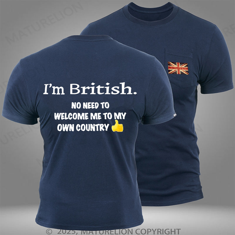 Maturelion British T-shirt I'm British No Need To Welcome Me To My Own Country Pocket T-shirt$29.99 USD -
