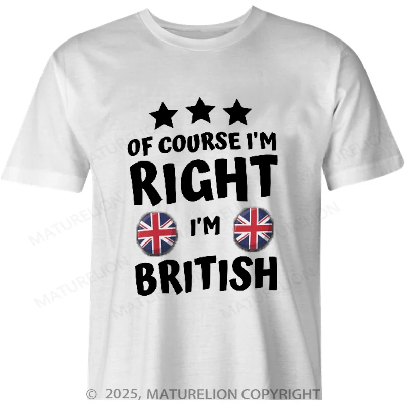 Maturelion British T-shirt Of Course I'm Right I'm British Cotton T-shirt$22.99 USD -