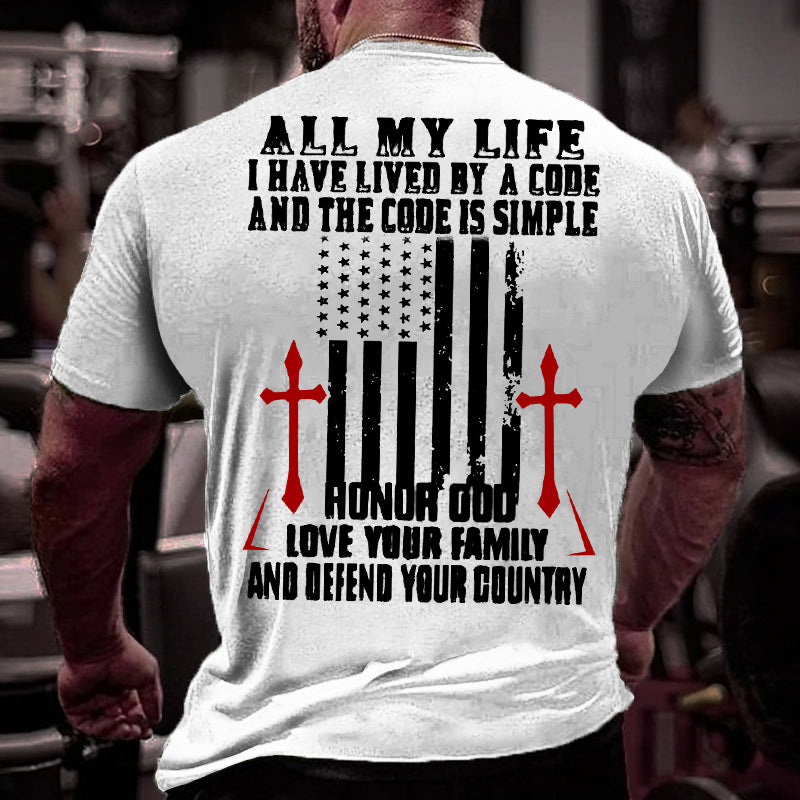 Defend your beliefs like a superhero! The T-shirt showcases your respect for God, family and country, making you remember your beliefs and strive to work towards them.Add a personal touch to your style with our customizable men's T-shirts. Whether it's your name, initials, or a special date, make a statement by having it embroidered on the sleeve. Stand out in a crowd with a tee that's truly yours!