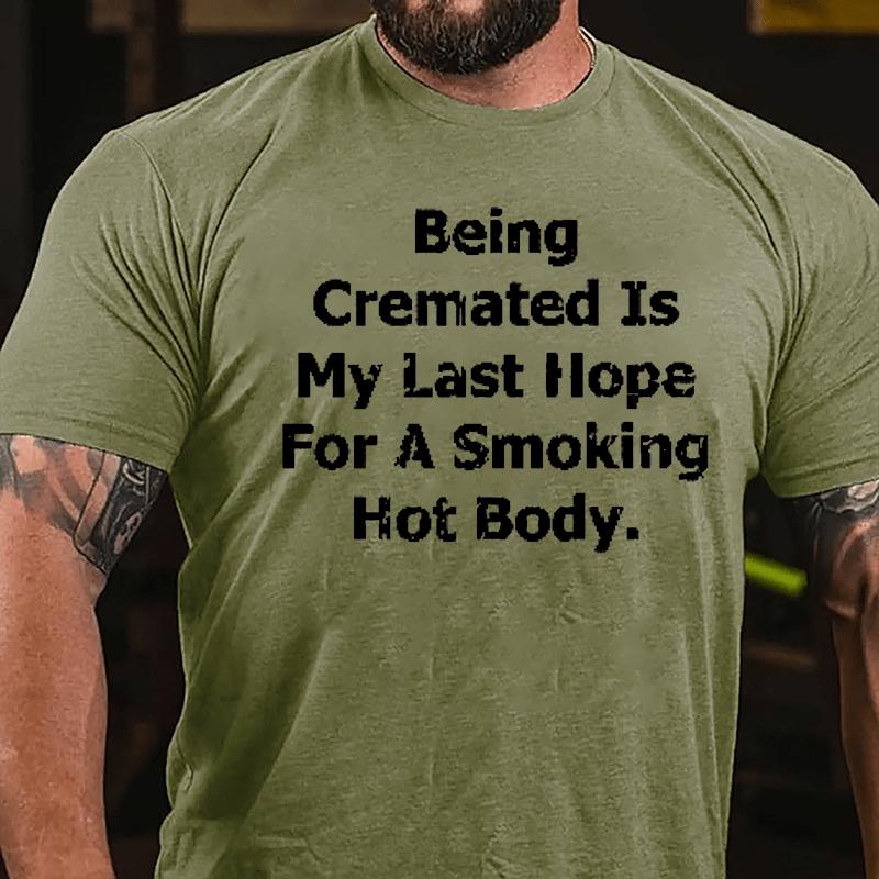 This T-shirt likely features a humorous and lighthearted design centered around the idea of achieving a fit or attractive body through the process of cremation. It suggests a playful take on body image and fitness.