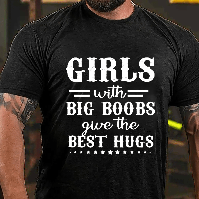 Do you know anyone that loves to give big hugs and has big boobs? Its slogan that makes a great gift for you, your bosum girlfriend, or wife. Show off your wit and make a fashion statement that reflects your unique sense of humor.Add a personal touch to your style with our customizable men's T-shirts. Whether it's your name, initials, or a special date, make a statement by having it embroidered on the sleeve. Stand out in a crowd with a tee that's truly yours!