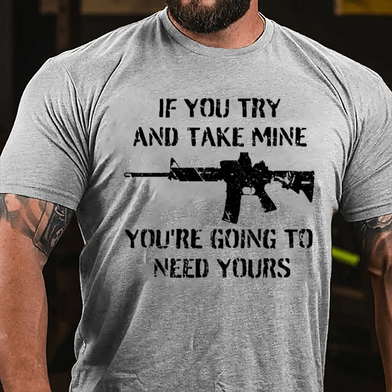 Make a bold statement with our T-shirt featuring the daring declaration accompanied by a striking gun graphic. This edgy and powerful tee is perfect for those who exude confidence and strength, sending a clear message to anyone who dares to challenge them.