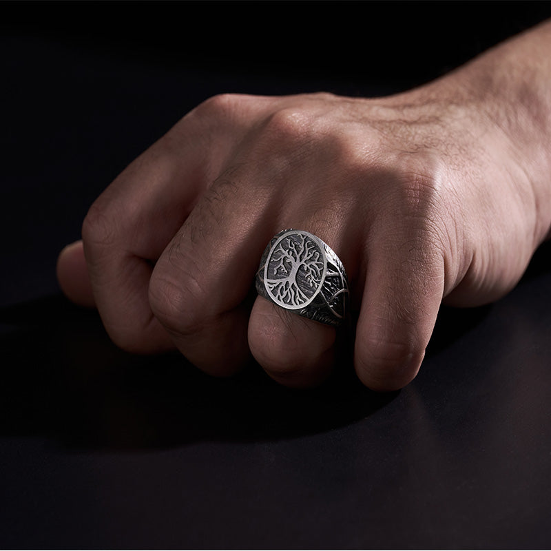 This Ancient Tree of Life Silver Ring is crafted from 925 sterling silver and oxidized to highlight the intricate, hand-engraved details.