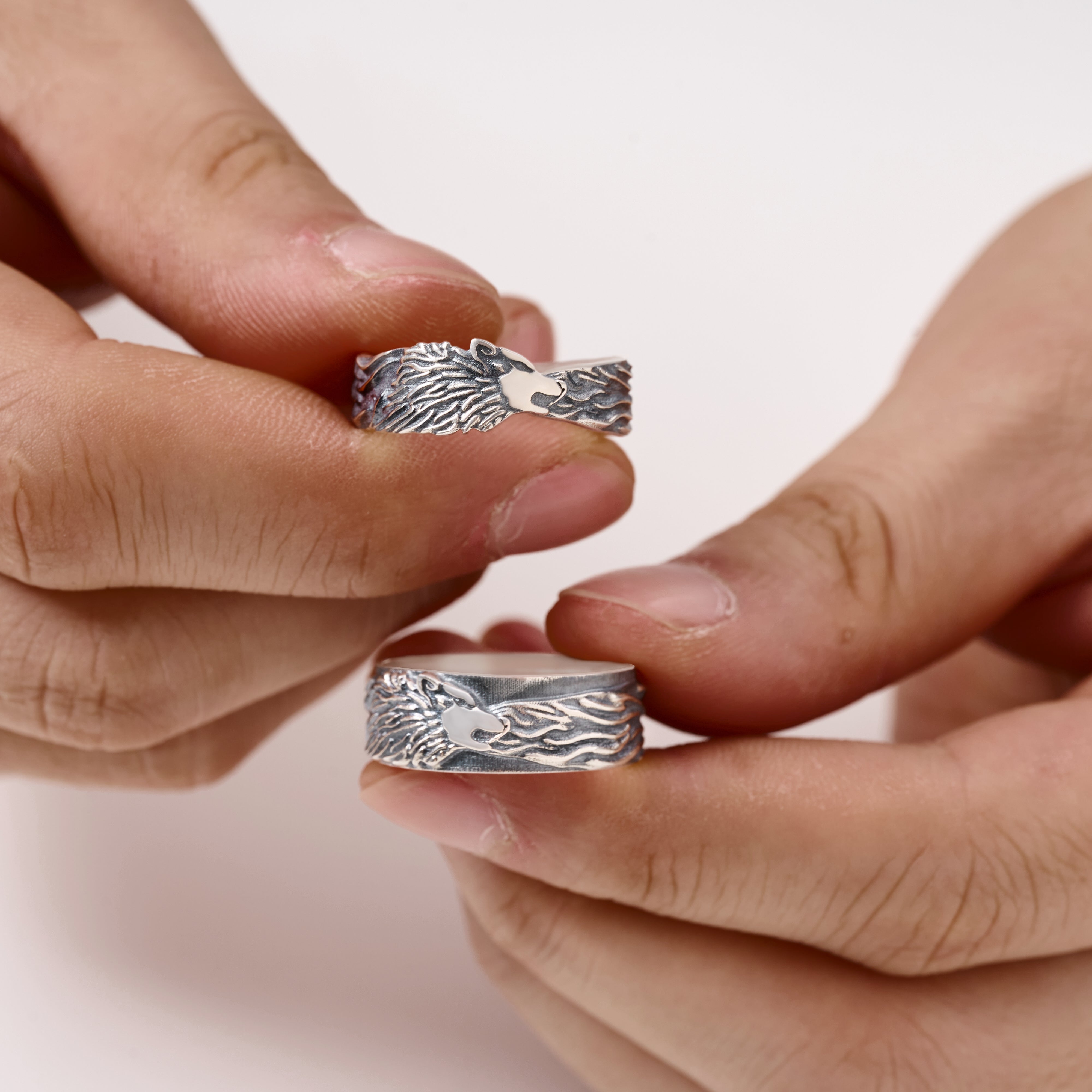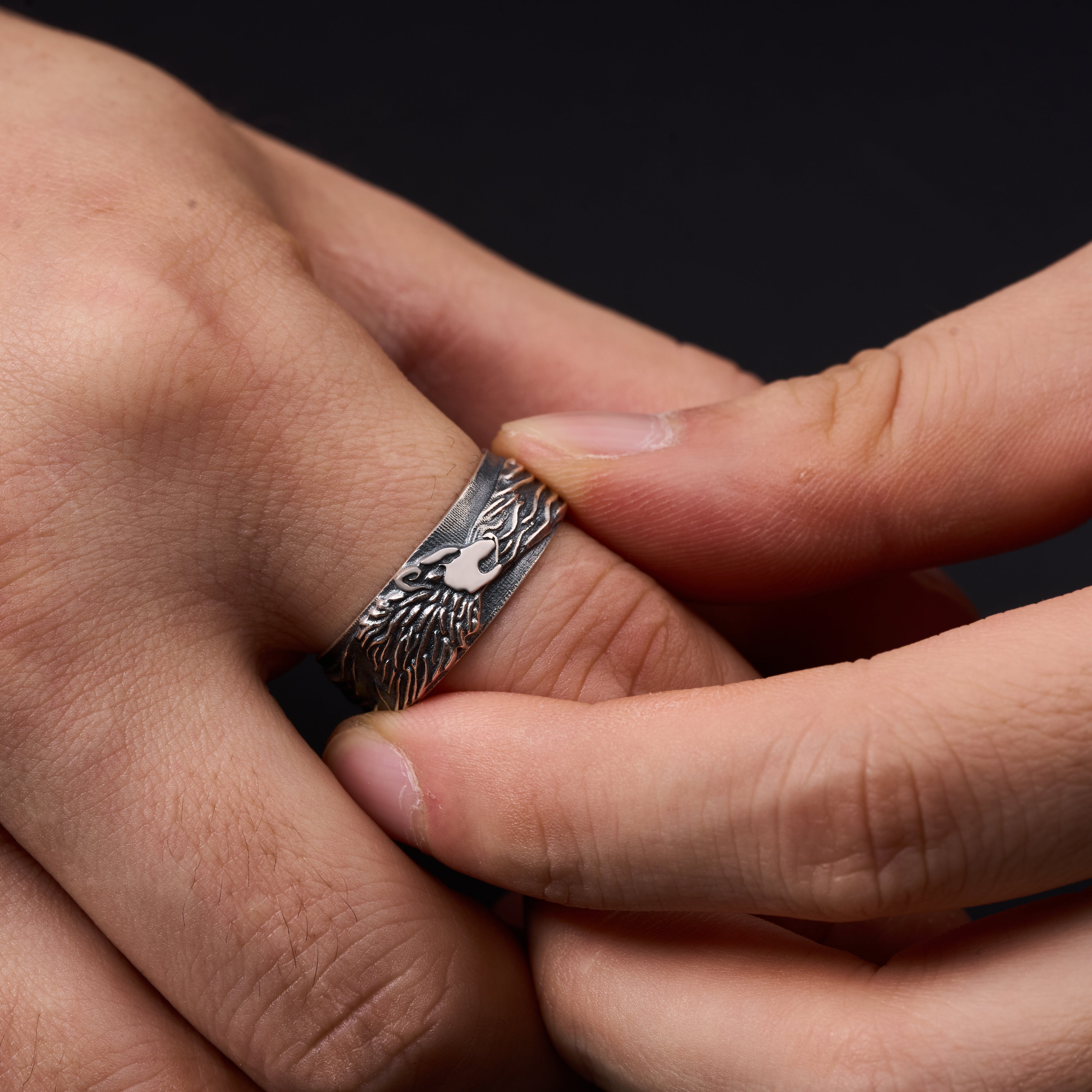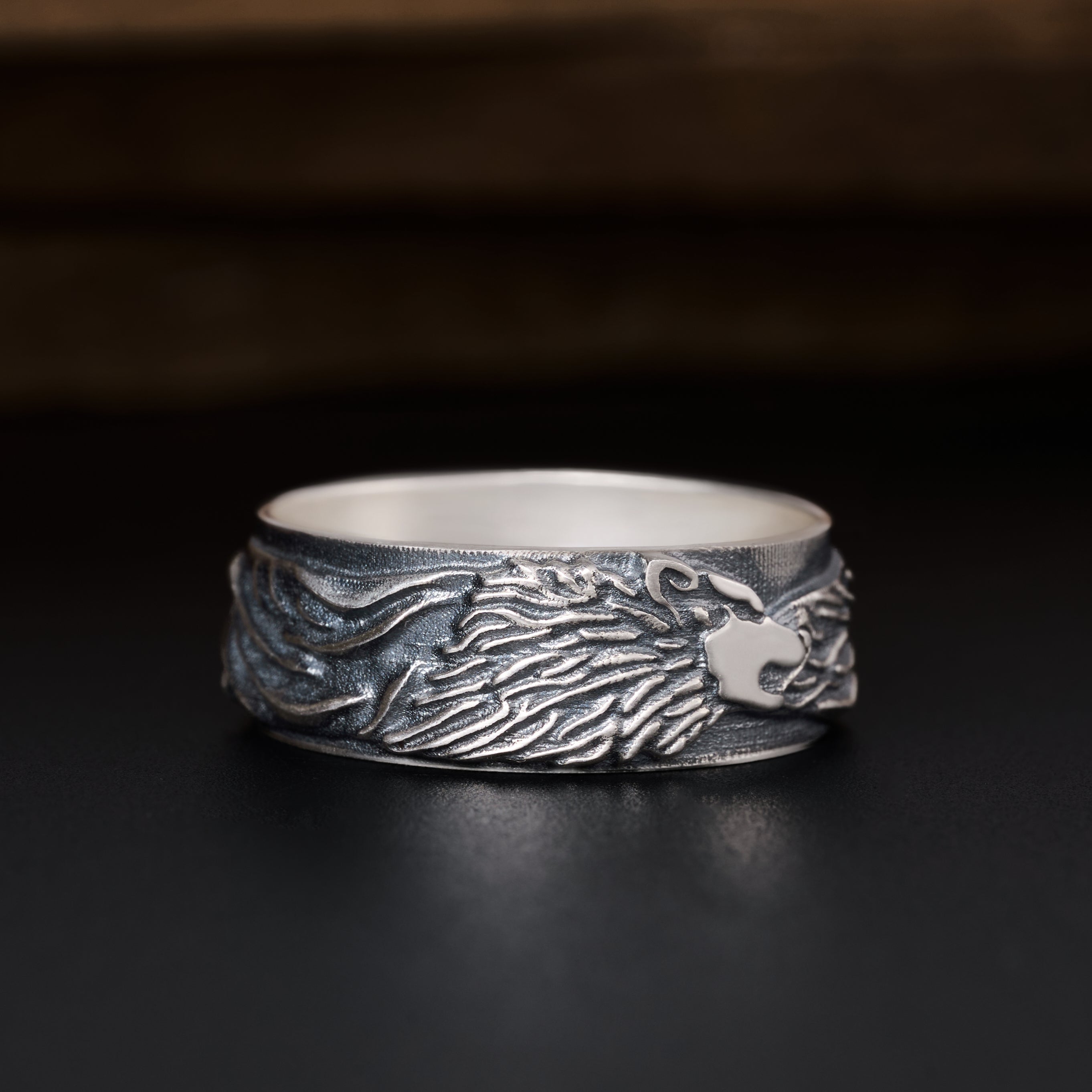 This Fierce Lion's Mane Band Ring is crafted from 925 sterling silver and oxidized to highlight the intricate, hand-engraved details.