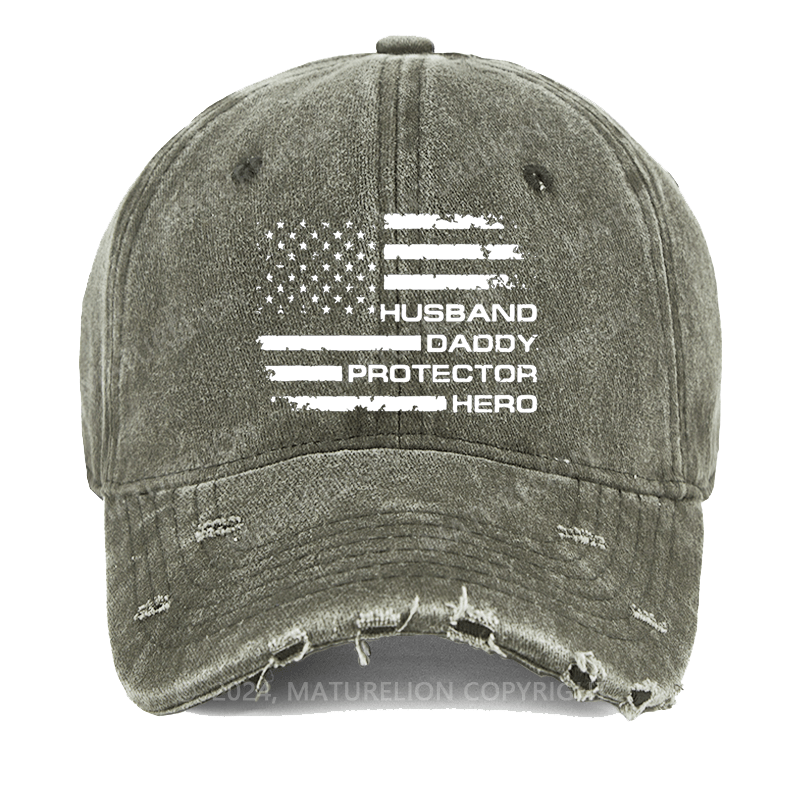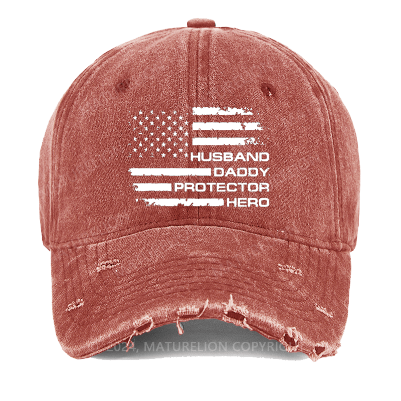 Maturelion Husband Daddy Protector Hero Fathers Day Camo American Flag Washed Vintage Cap