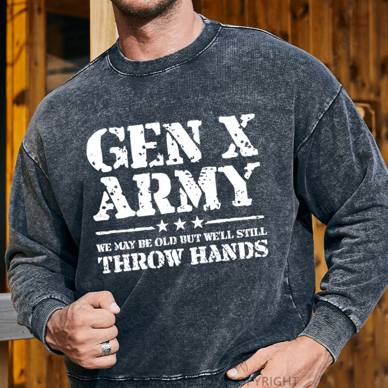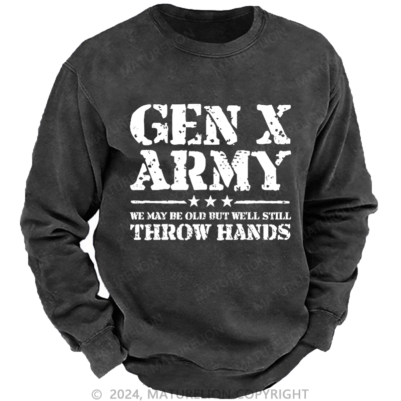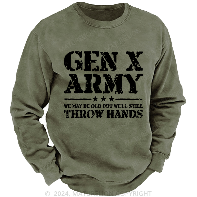 Maturelion Men's Sweatshirt Gen X Army We May Be Old Bu't We'll Stiil Throw Hands Custom Washed Sweatshirt